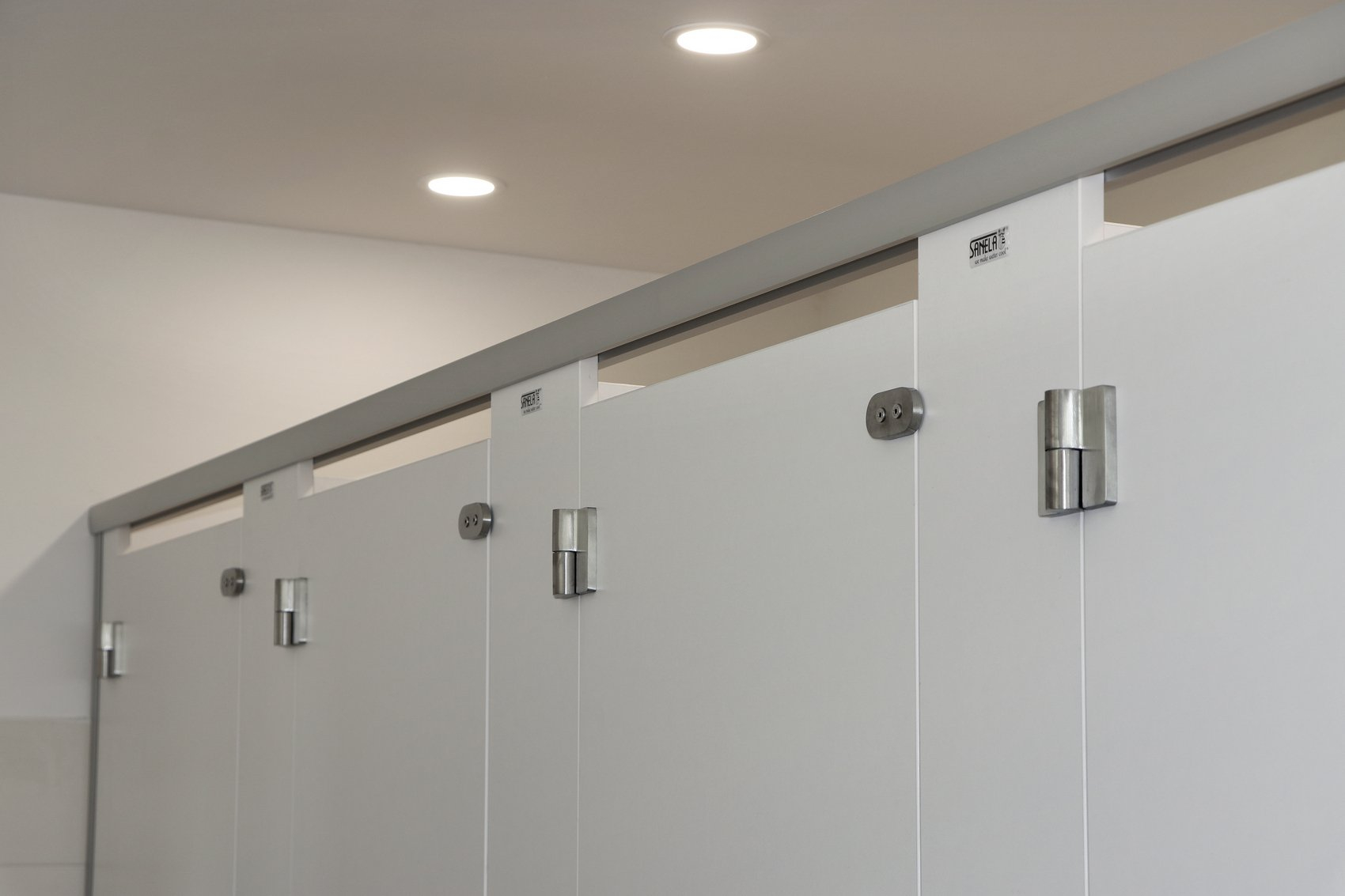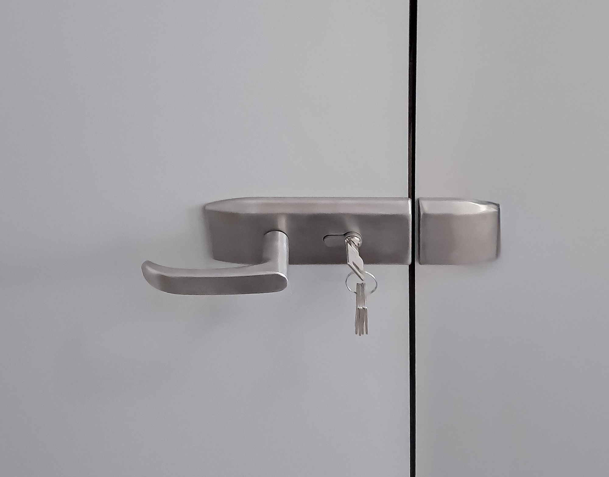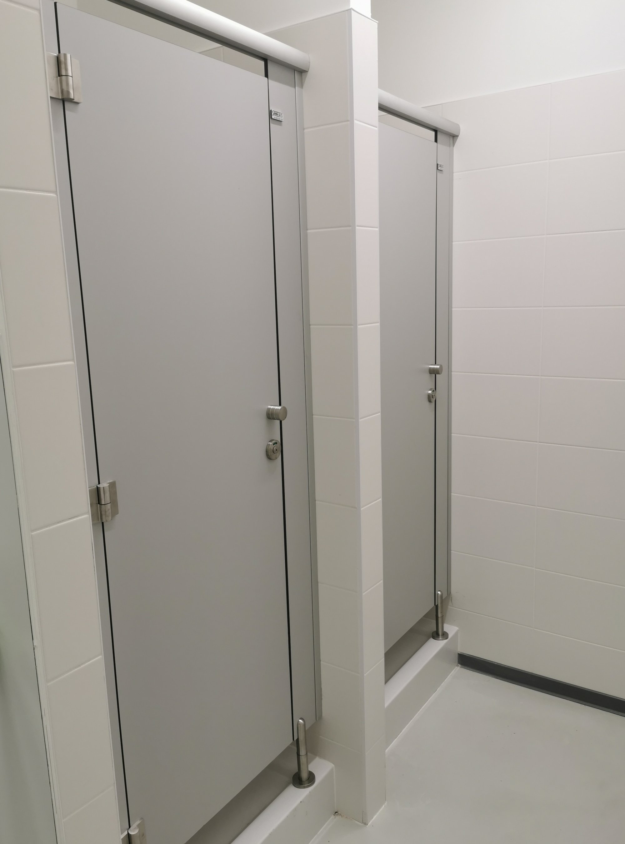 | Dvere: | laminát HPL o hr. 12 mm, samozatváracie pánty, nerezový zatvárač so signalizáciou voľno/obsadené, farba štandardná šedá alebo biela, ďalšie farby za príplatok |