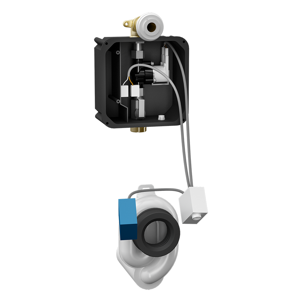 SLP 12R - obj. č. 01124 - keramický pisoár s radarovým splachovačom vrátane modulu Bluetooth, plastová montážna krabica so skrutkovaním, elektromagnetickým ventilom a guľovým ventilom, výtoková armatúra s tesnením, sifón, upevňovacia sada