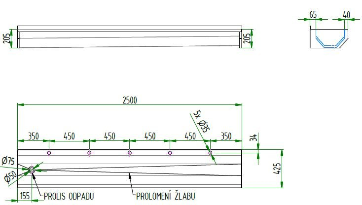 SLUN 10D - obj. č. 93102 - nerezový umývací žľab 2500 mm, sifón, upevňovacia sada, 2 ks konzoly